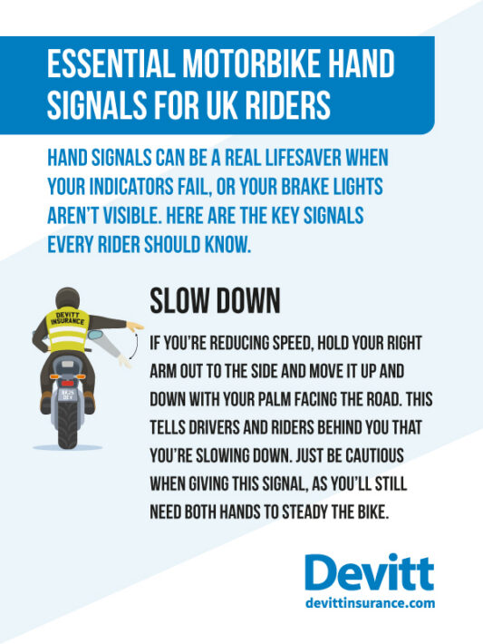Motorbike hand signals might seem old-fashioned, but they’re still a vital part of safe riding. If your indicators fail, conditions make your lights hard to spot, or you’re out on a group ride, clear hand signals help other road users understand exactly what you’re doing.